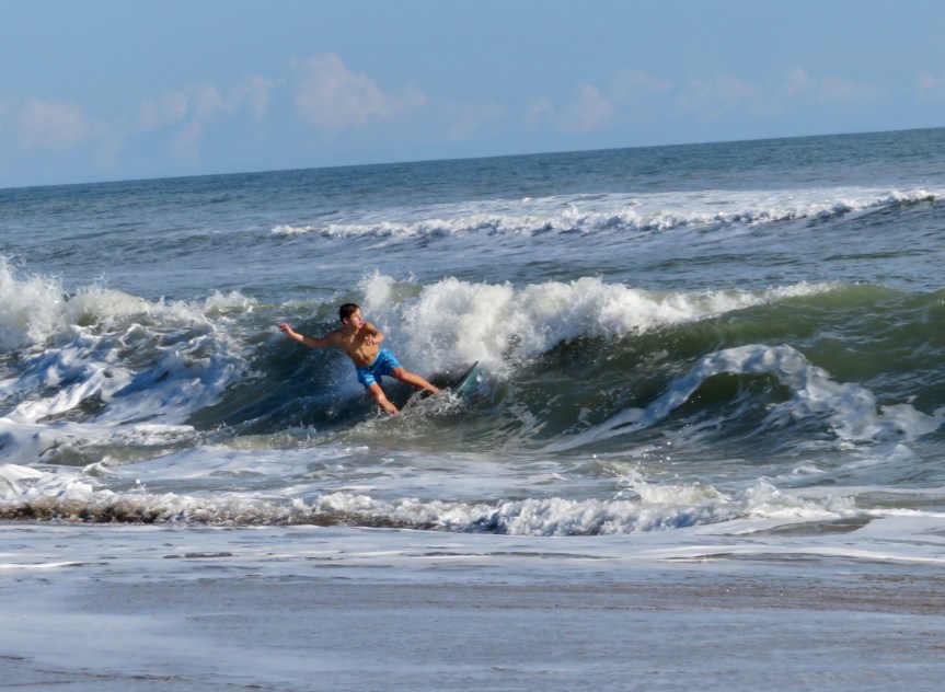 Fishing boats were plying the calm seas while kids on the beach were playing with skim boards in the small waves breaking right up on the shore. Fisherman were casting their lures and hoping for a lucky strike. The pier down the way had really taken a hit from the hurricane and large sections had been lost to the sea. Cali was over walking in the sand and decided it was time to head back to Wilson for an afternoon nap.
