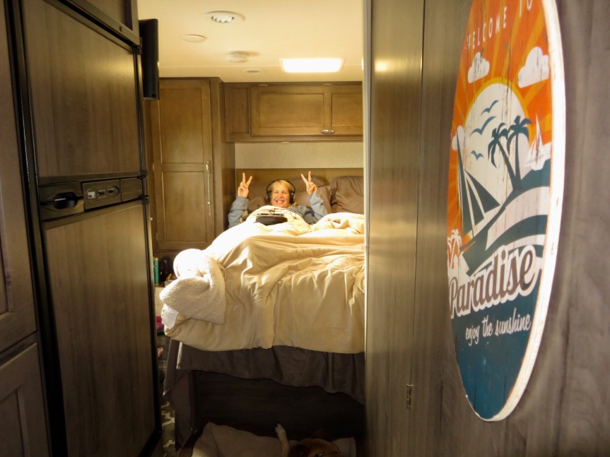 In the afternoon, we walked over to the nearby strip mall and ordered up a couple of strombolis at the little Italian restaurant there, the only business open as the season is winding down. We took them back to the RV and ate them indoors. Naps and dog walks, reading and meditating. A total lounge day.