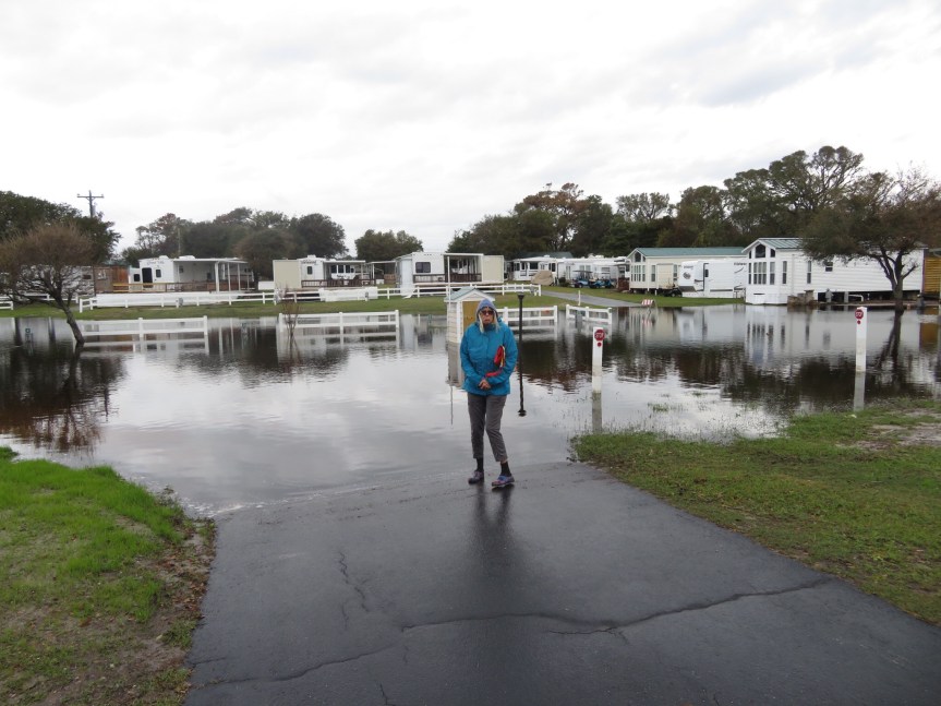 A quiet laid back day on Emerald Isle. It was raining fairly steadily when we woke up so it was a day of huddling up and staying warm inside. We forayed out on occasion when the precipitation seems to ease up to give Cali a little break. The lower section of the RV park is still underwater from the hurricane as things are slowly drying out.