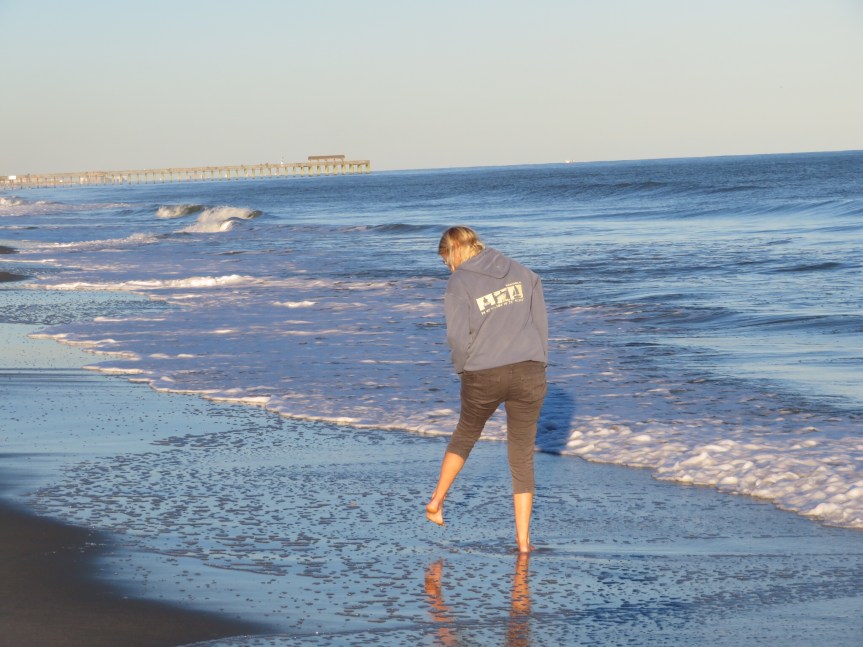 We parked at the beach parking area and power walked the beach to the south to have a look at an RV “resort” down the coast from our campground. Pirateland had some okay amenities but the spots were way too close and wide open. We wandered around for a few minutes until PJ stepped on some stickers and we hastened back to the beach and walked the shore back to MBSP. The sun was shining and it was a lovely evening.