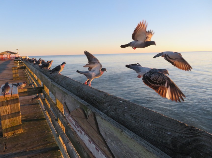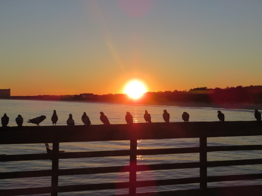 Rather than rush back to camp, we made a stop at the pier and walked out to get a good view of the sunset. A few fishermen were giving it a go and some couples were enjoying the mild weather. As the sun was nearing the horizon, all of the pigeons from near and far arrived to line up on the railing and watch the sun go down. A picturesque scene as the sky turned golden to the sound of flapping wings. Then it was back to Cali and to set up our mini Xmas lights that we picked up while out shopping.
