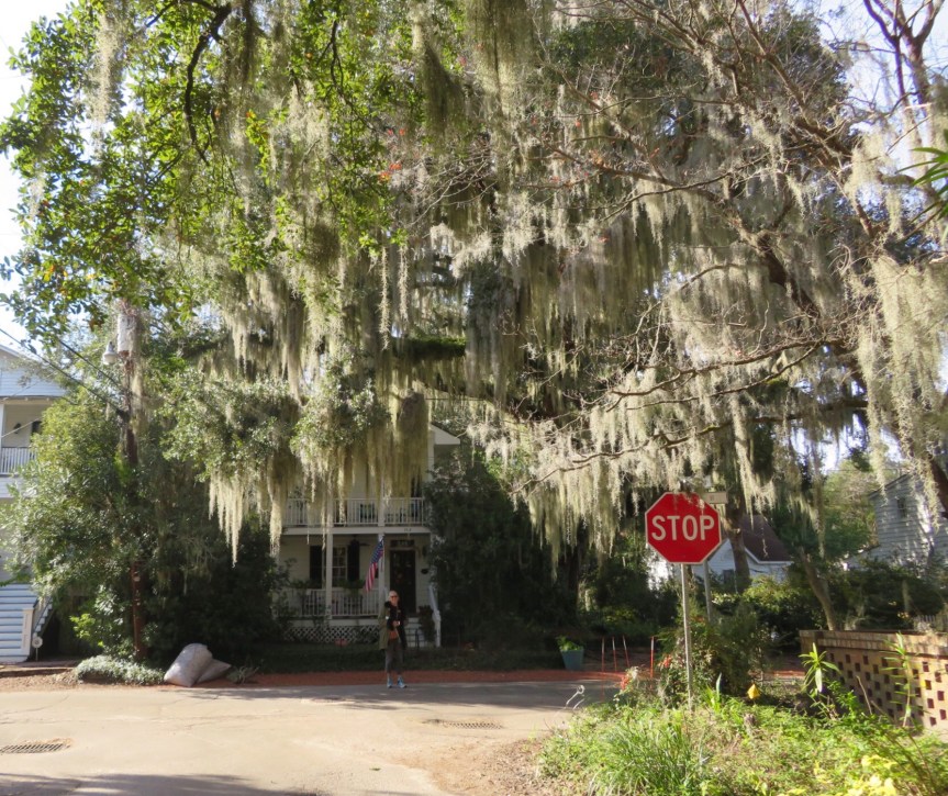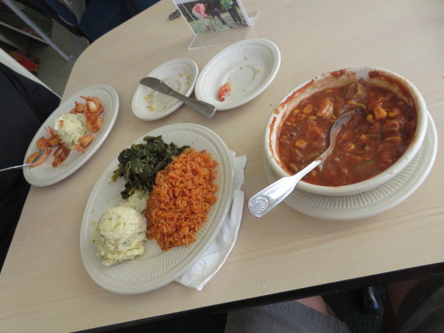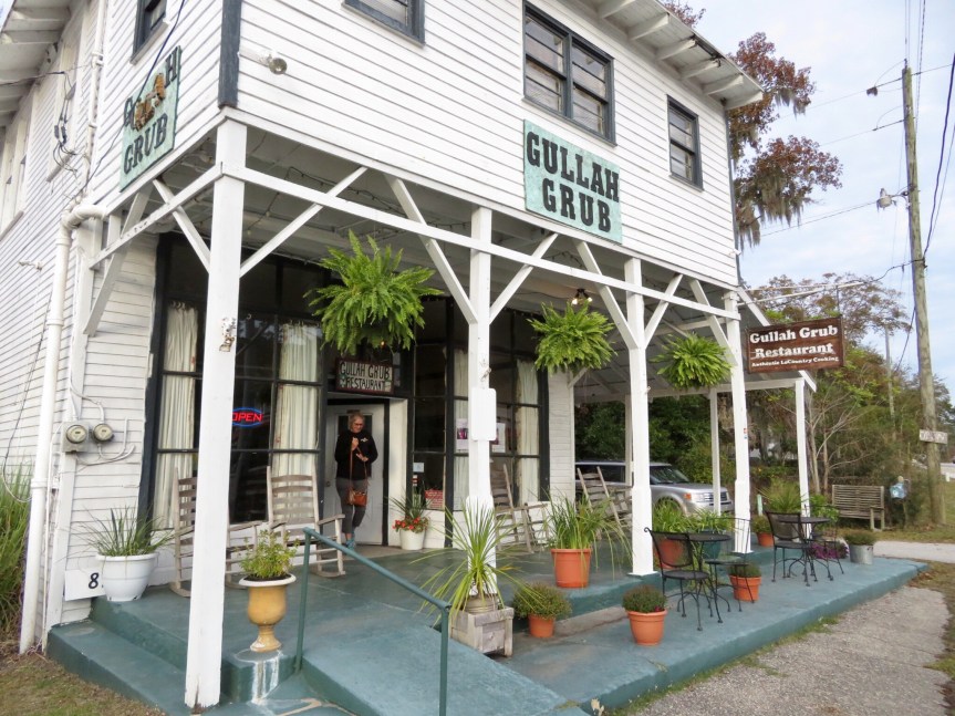 Service at Gullah Grub moved at a snail’s pace. The older Gullah gentleman worked as waiter, cook and host. He got each table’s order, returned to the kitchen and cooked it up. After completing that table’s meal, he moved on to the next table. It was laid back and he was cool to talk to. He works with local kids to pass on the Gullah culture by teaching them how to grow and harvest the food used in cooking. Everything’s fresh and the food changes with the season using only local ingredients that are available at the time. He put his gentle spirit into the making of our lunch. We had a rich shrimp gumbo, red rice, collard greens, fried shrimp, corn pone and potato salad. For beverages we had swamp water and topped it all off by splitting a slice of sweet potato pie. A unique experience.