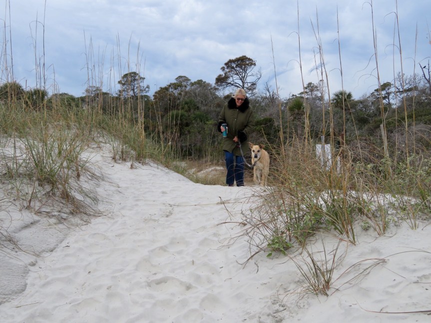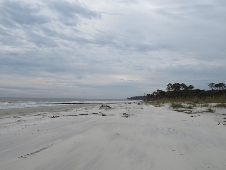 The news has been whipping up the mania of the giant storm heading across the U.S., so being camped in a low lying area on an outer island that has already been trashed by two recent hurricanes, we decided to flee the oncoming peril. After putting everything away, we took Cali out for one last windy stroll on the beautiful beach at Hunting Island. The clouds were looking ominous but no rain as yet.