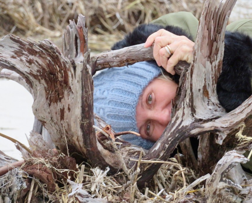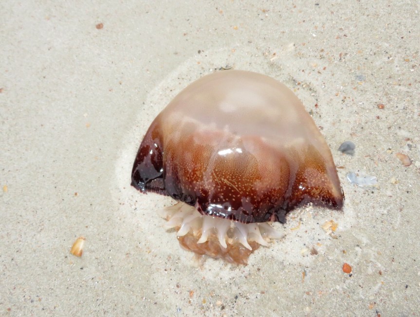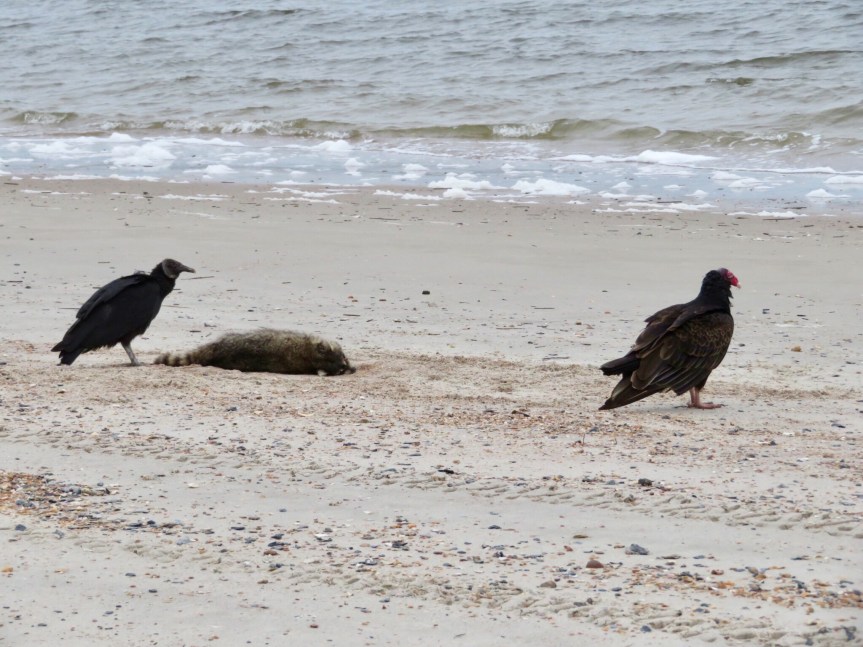 We are at the tip of the island and if we travel along the top of it we should eventually round the corner and bring us to the Atlantic side of the park. Needing some exercise and the fact that it was hovering at around forty degrees, we turned it into a power walk and leaving Cali to nap we sped off down the beach into the chilling wind. Some buzzards were enjoying a gourmet entree of entrail de’ raccoon and the wind had stranded a scattering of jellyfish along the shore. It soon became apparent that the Atlantic was a bit further down the lane than I had anticipated.