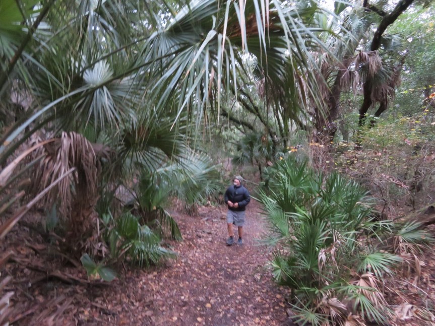 After a half an hour of hard walking, we passed Fort Clinch then continued to an outcropping of land and still couldn’t see the alleged fishing pier or Atlantic. As the sun was going down, we felt it prudent to start heading back before we got caught out in the dark. Next to the fort, we left the beach and continued our trek crossing through the woods Now we’d really be lost of it got too dark so we kept trudging along. It was a scenic bit of trail with little markers explaining all of the trees and their niche in the Florida ecosystem. Unfortunately, we didn’t have time to read any of them so we’ll have to come back tomorrow. I did learn from a quick glance out of the corner of my eye that Myrtle is a tree. Who’d of thought.