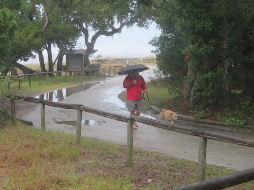 On the move again. The rain had already begun as we were breaking down camp. It wasn’t supposed to arrive until early afternoon but here it was. Wiped off the muddy hose and rolled it up then cleaned off the power cord as I pulled it up through its little port hole into the compartment. By 11:00, we were checked out and saying farewell to the lovely little campground at Fort Clinch. Definitely one of the better stays in our travels.
