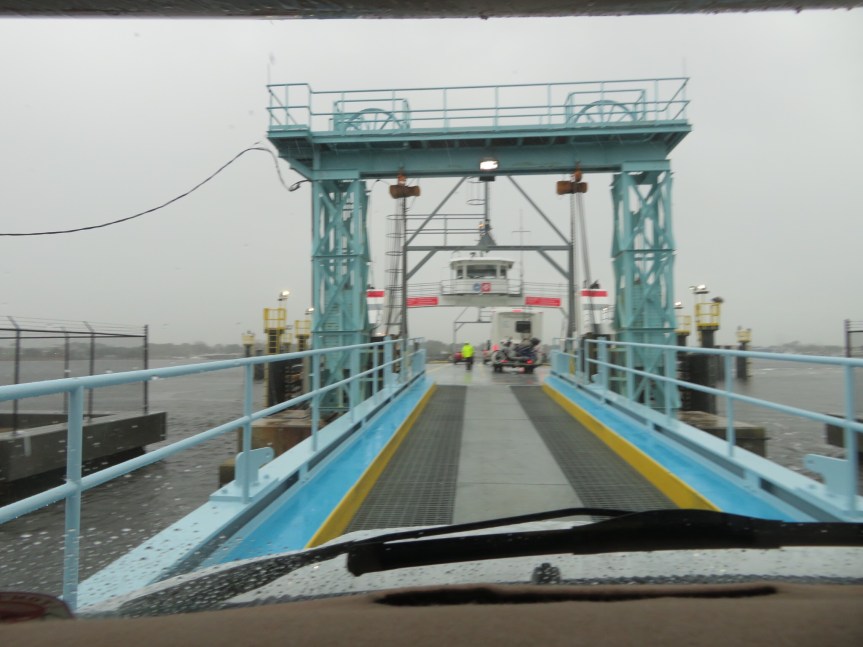 I went to U-Haul to to top off the propane but the kid there said he couldn’t do it in the rain. That was a new one on me, but maybe there’s some reason. Anyway, we have enough for several days so we just continued on south down the islands. We took A1A along the coast through Big and Little Talbot Islands then over to the ferry that took us across the sound to Mayport.