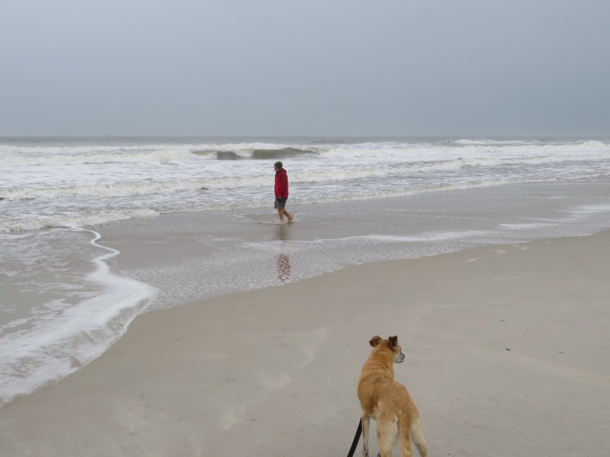 Rain had been pouring steadily all of the way, occasionally diminishing visibility. We got to Kathryn Abbey Hanna a little after noon and set up our soggy site in the downpour. We settled in and had a bite of lunch. When we detected a break in the rain, we leashed up Cali and walked through the woods over to the beach on the Atlantic shore. Small waves pushed relentlessly onto the sand and shore birds ruled the empty beach. An osprey was perched on the top of a pole feasting on a still kicking fish. This area looks like it is going to be pretty cool when it dries out.