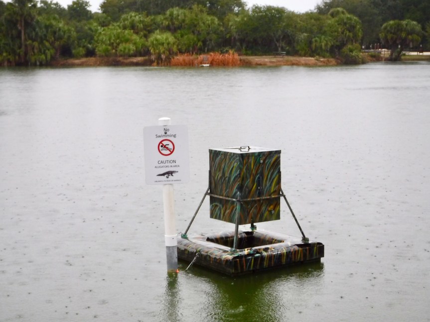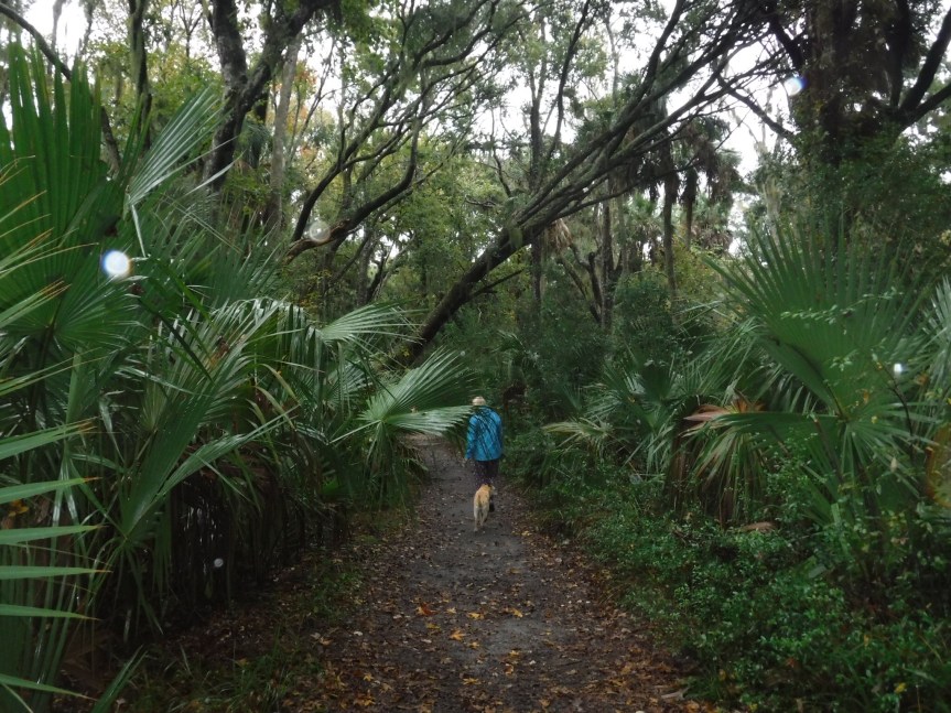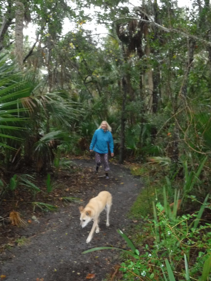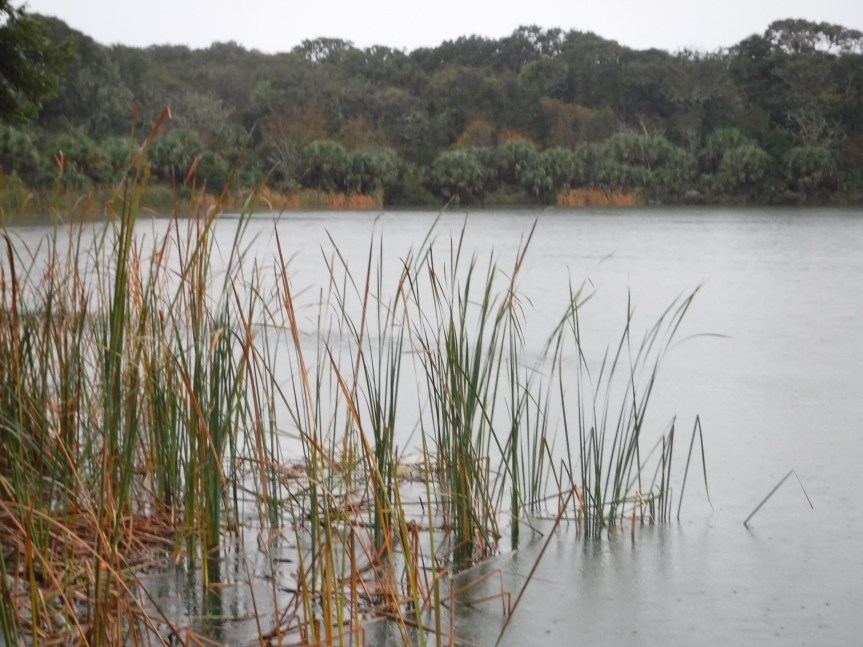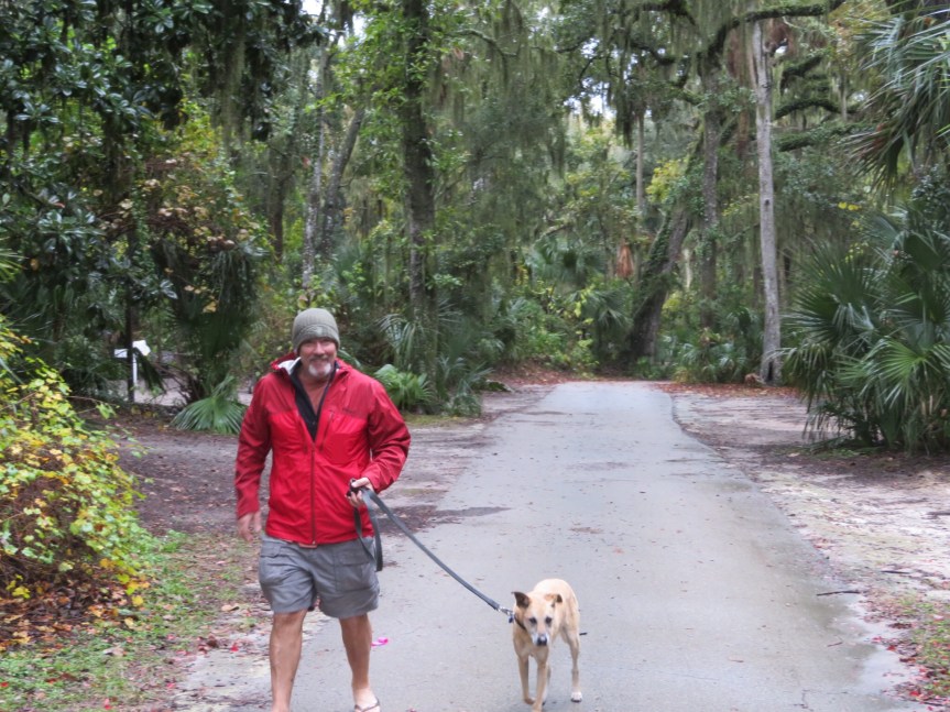 We hiked back into the campground and over past our camp to have a peek at the lake that sits behind our site. They had warnings for gators, but we didn’t see any lurking along the banks. The rain was picking up in tempo so we kicked up the tempo of our walk and fled back to relative dryness of the RV. All through the evening and into the night a steady moderate rain continued unabated. The weather guy on News Jax stressed that it wasn’t how hard it was raining but how consistently. They are expecting six inches by the time this finishes up tomorrow afternoon. House bound travelers!
