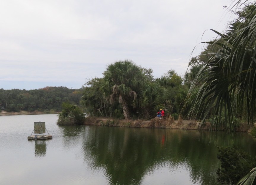 A few roads further into the park is the dirt lane into the back side of the lake where I walk Cali in the mornings. We always see it from afar, so I pumped the pedals on over there and rode around having a look. There’s a big playground in that section so lots of kids and families were running about having fun. A group of special needs folks, stroke survivors and such, were just returning from a kayaking adventure put on by a group of volunteers. I talked to a couple of the guys for a few minutes about the general area. They told me there are still alligators out and around. In fact, he’d just seen some young ones over by the back ponds.