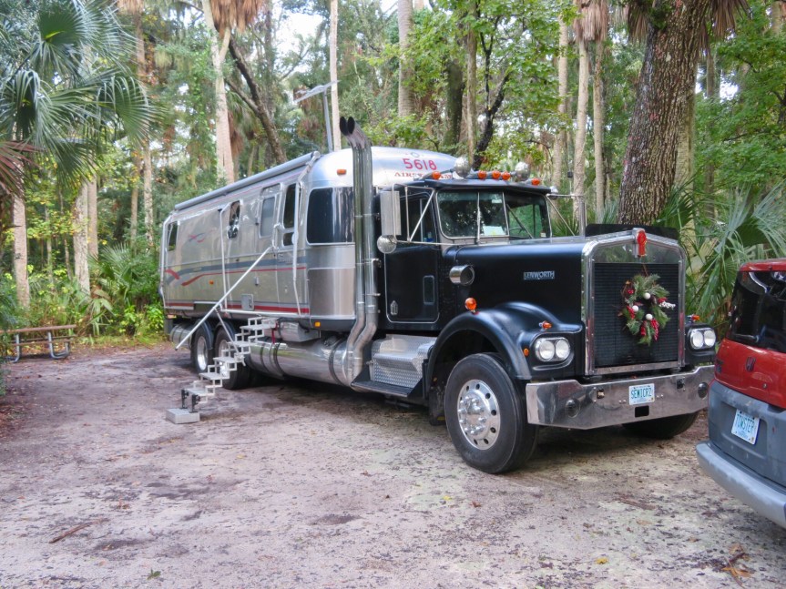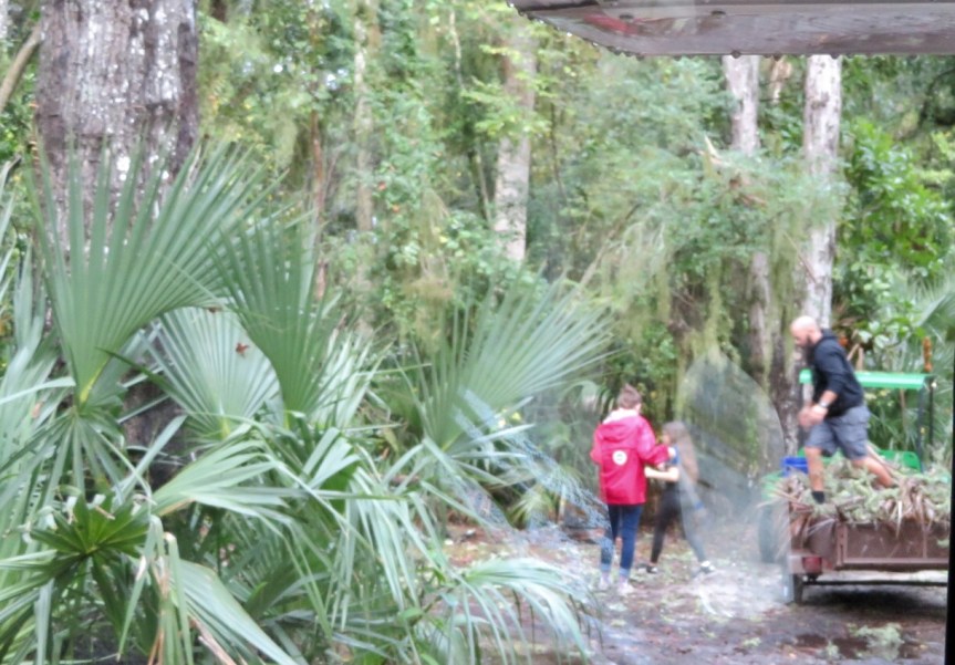 For about an hour during the mid morning, a cell of severe weather blew through our little forest jostling the tall trees and sending palm fronds and branches hurtling through the air. It was getting hairy watching all of the flotsam dropping all around. A few medium sized branches banged onto the roof and lots of small debris was raining down. I went out to see how bad it was and walked up to the end of the row to see if the camp host had any information. He wasn’t home but a few larger palm fronds flew by bouncing off of their trailer. Some bigger chunks of foliage started landing nearby and it was clear that I’d be better off inside so I hustled back to the RV.