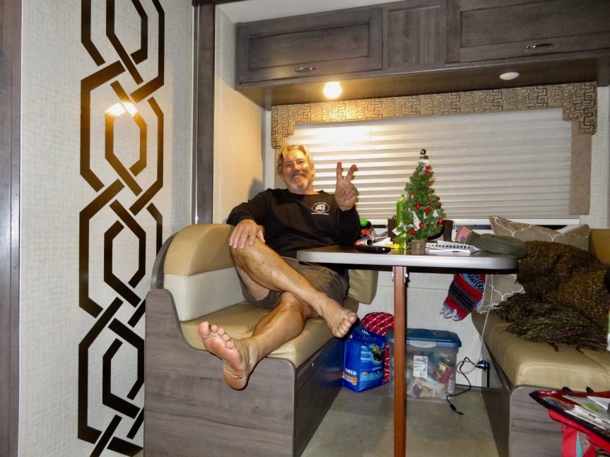 A lazy day for us two. Did a lot of lounging around inside and didn’t get much of anything done. I cooked up some shrimp with mushrooms and spinach then served it to myself with a scoop of rice. I was encouraged to see Cali munch a bunch of dry food. A few late night wanders around the park but not much other activity. Rain’s gone but it supposed to be high winds tomorrow. We’ll see what the morning dishes up.