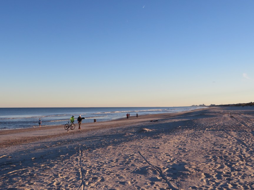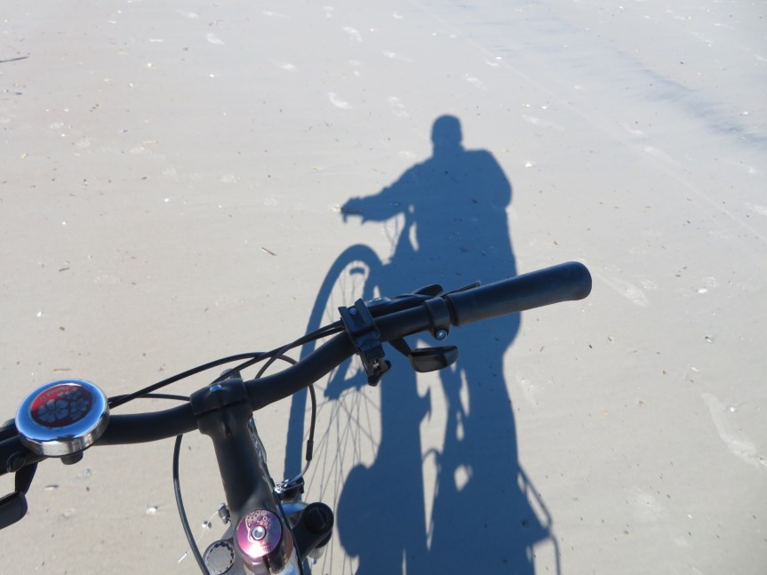 The campground is really lively now that the kids are out of school. The park is pushing maybe 50% full. Even with the cold temps, bikes are abundant – kids bikes, mountain bikes and oldies on hybrids. After lunch, I jumped on the velo bandwagon and unlocked the bike and set off to tool around the park. I started out on the mile or so of paved parking road that connects all of the beach access areas. I stopped at a few different beaches and when I reached the poles where the park ends and the Navy Base begins I took the bike out on the sand and rode back down to boardwalk 11 and back along the Atlantic.