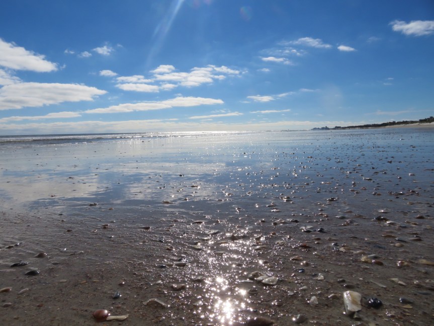I rode back down to Dolphin Plaza and locked up the bike and went out for my new obsession of finding a shark tooth. I gave it a good go, but I guess it’s not meant to be. It’s a meditative practice so no disappointment. I noticed the sun nearing the horizon so I spun the gears back over to the lake to see about getting a view of the sunset. I sat on a bench and watched it melt behind the woods on the far side where we are all camped.