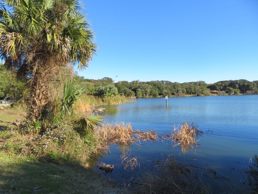 When I got back to the poles, I rode over to the ponds to give searching for alligators another shot. I peeked around all the little coves and back ponds. I saw a few big turtles sunning themselves on a log and lots of cool birds. I though there’d be more people than there were but still some fisherman and a group of people having a big picnic. The afternoon had warmed up nicely reaching the low sixties.