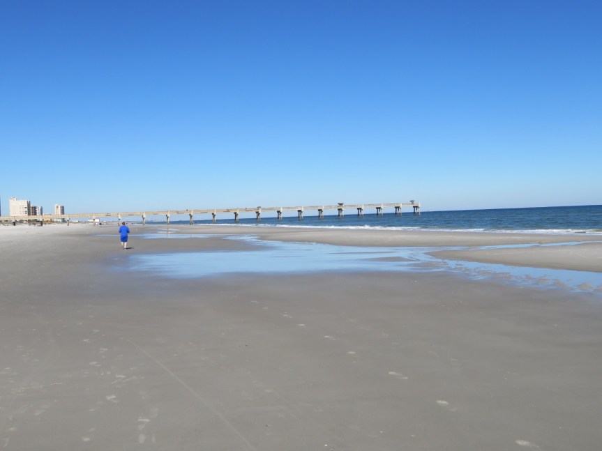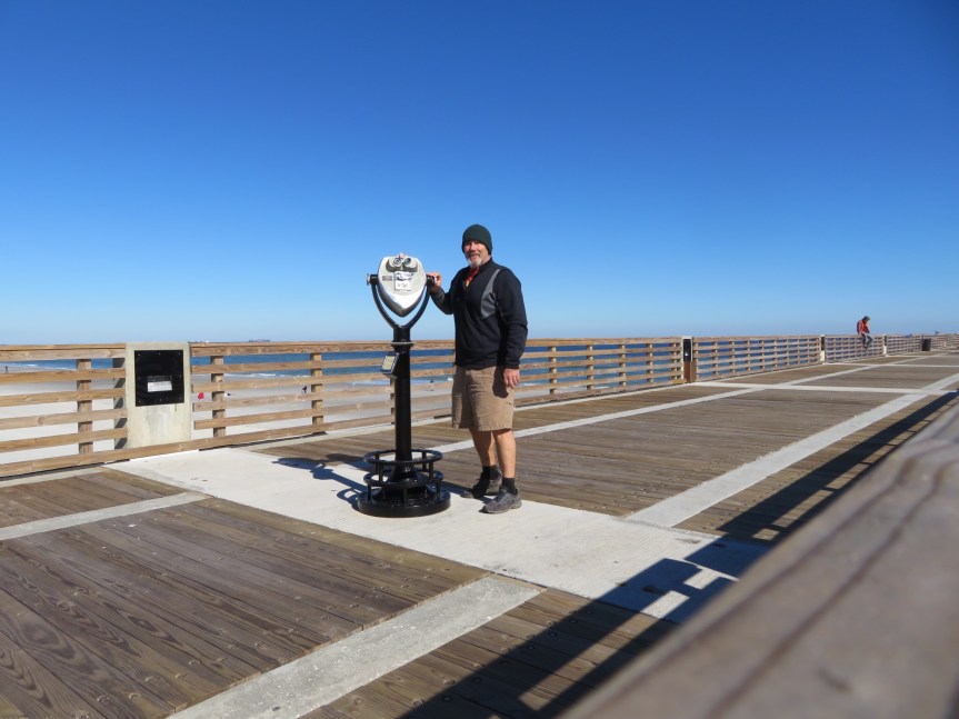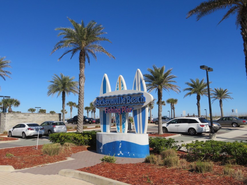 Afterwards, I did a bit of exploring and went over to have a look at the Jacksonville Beach pier. Although PJ doesn’t know it yet, she picked me up a small Xmas gift at the Rip Curl shop where we bought our wetsuits last week. At the beach out front, there was a wide variety of people out to enjoy a sunny Sunday on the sand. Some of the homeless people that make the pier area their home were still sleeping out on their makeshift camps on the beach. Families were posing for Christmas pictures while joggers and cyclists sped on past. From the park area with the decorated chairs, I strode over to the pier and had to lay down a buck at the kiosk to get onto the wharf. The sun sparkled off the ocean as an osprey dived into the water and re-emerged with a struggling fish in his claws. Some fishermen were angling for whatever would bite over near the end but it didn’t appear they were having much luck. I walked around the shops surrounding the pier for a few minutes then headed over to Publix to grab some food.