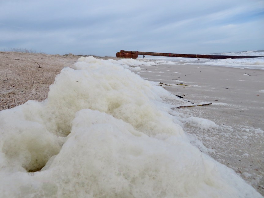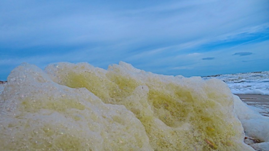 A couple of nondescript days at Hanna campground. I haven’t been feeling all that great and I think I had a hangover from the Thai food I ate last night. ‘Tiger Cried’ was the name of the dish but the only thing crying was my stomach. I do pretty good with spicy food but this one caused me intestinal damage. Cali and I started out the day with a hike down the trail to the beach. We walked as far as the dredge pipe by pavilion 8. The storm had whipped up a bunch of suspicious looking foam that was piling up on the beach. Cali didn’t seem to mind being out in the wind today. She was in good tune. No shark teeth, so we returned to the RV for some breakfast.