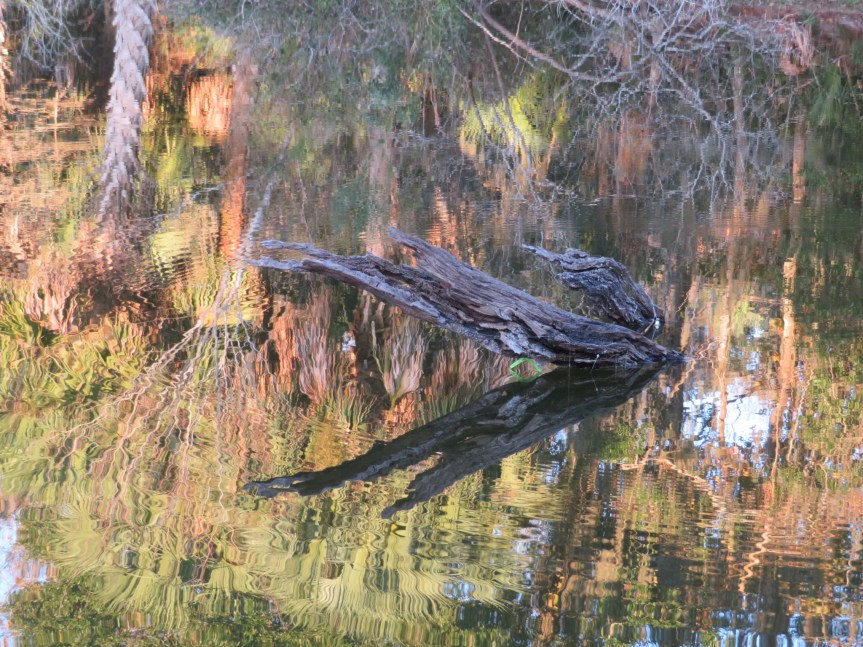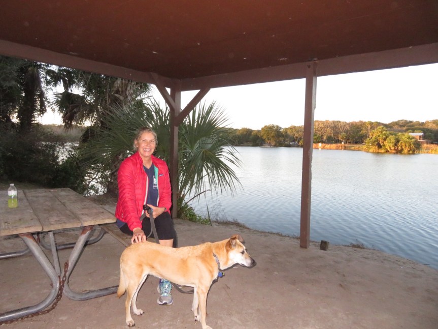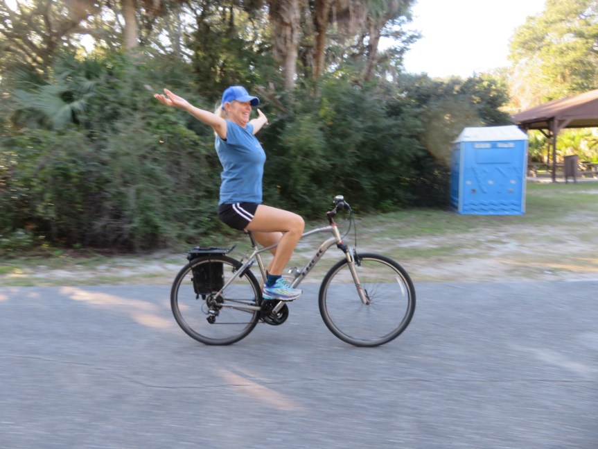 Today, we loafed around our campsite for most of the morning avoiding the mass exodus. The camp host told us over 120 campers pulled out this morning. Cali got herself a bath to start off the year. She seemed pleased to be nice and sparkly clean. We rode our bikes around the park stopping at the different beach areas to check out the large crowds that have come down to enjoy the warmest New Year’s in Jacksonville’s history at 83 degrees. We locked up the bikes down by the poles and walked the shoreline searching for shark teeth.