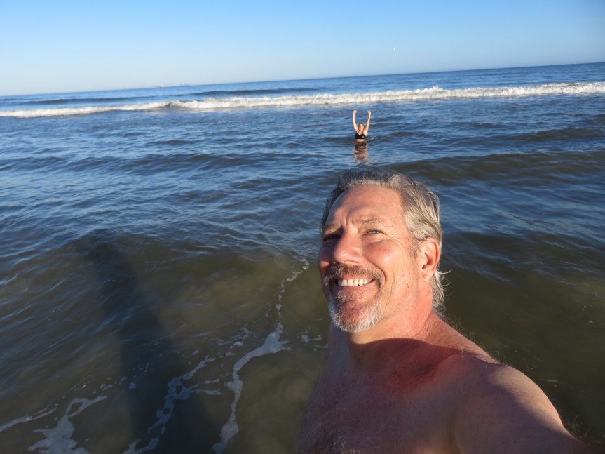PJ got it into her head that we needed to do a polar bear plunge to start off the year. After some feeble protest, I caved and we jumped into the chilly waters wearing my canvas shorts and Duluth chonies. Awake and refreshed, we wandered around the sand a while longer to dry off a bit before biking back. Still no teeth, but we talked to a girl that found six yesterday so I guess they must be out there.