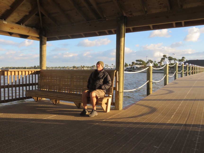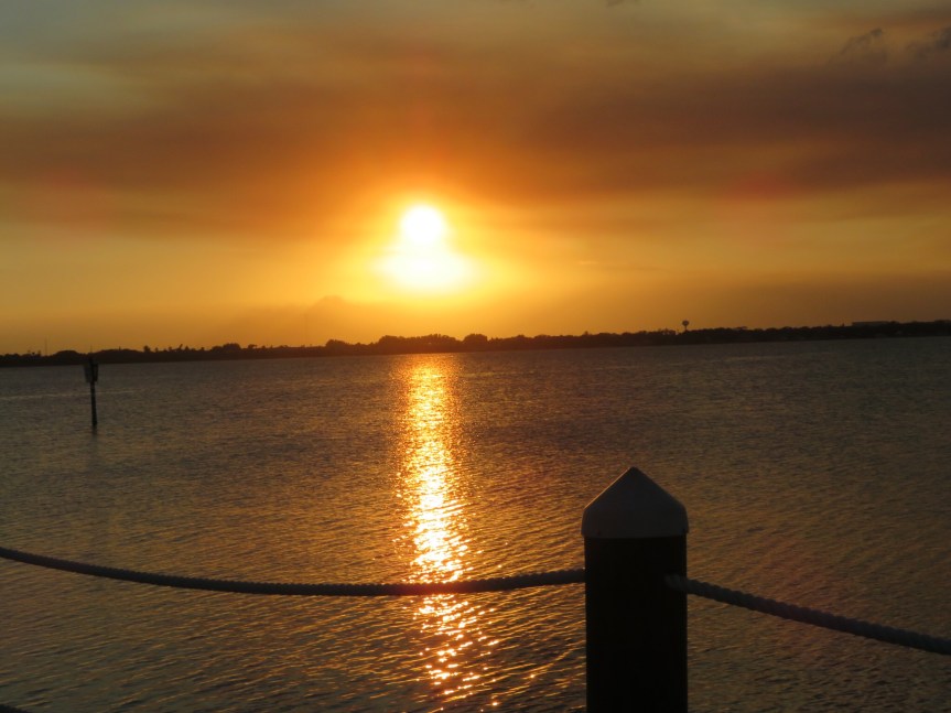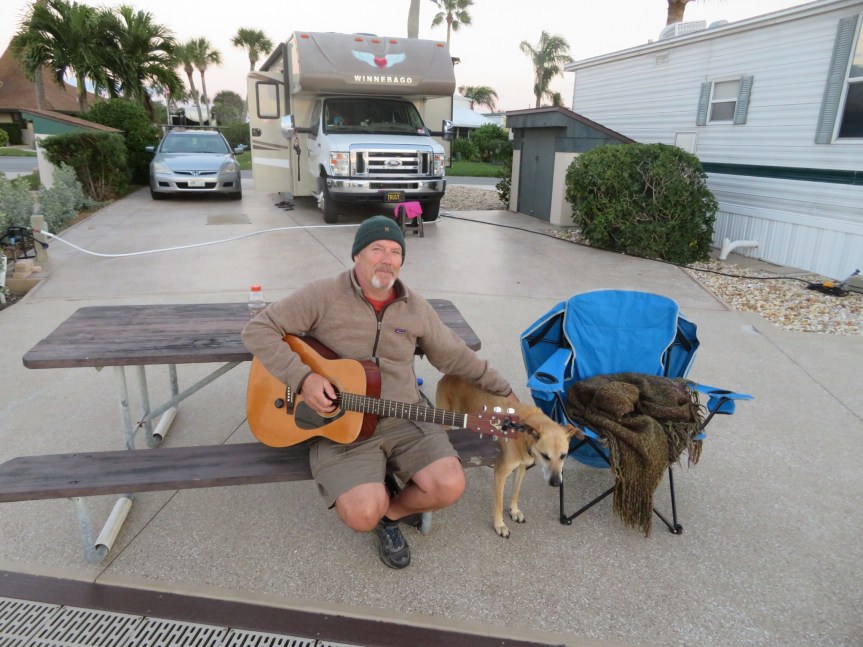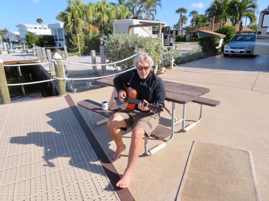 Back at camp we had new neighbors. The Canadians that were next to us headed home today and when we pulled up tonight Wilson’s twin was set up in their place. It looks like a rental RV with Colorado plates. Maybe we’ll learn more tomorrow. We sat out in the pleasant evening and watched another sunset and strummed a few more tunes on the guitar. I heated up some soup and we dined on that with a little cheese and crackers. Easy living. Got to be careful of the powerful Florida sun.