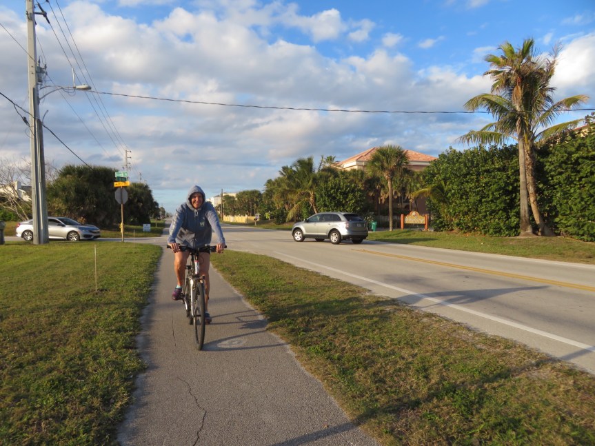 As evening approached we rallied and mounted our bicycles to check out the surrounding neighborhoods. We rode south on A1A for a while then turned into some side streets to have a look around. We returned to Outdoor Resorts and PJ had a look at the beachfront pool and hang out area. Across the street on the resort side there is a 7-11, a veterinarian and a little ice cream shop. We grabbed a few things at the store then I went into the vet and made an appointment to get Cali’s nails clipped tomorrow. PJ succumbed to the temptation of the ice cream shop and we ordered up a couple of cones and munched them in front of the stand.