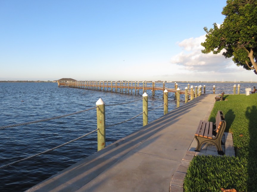 This morning after walking Cali, I took an exploratory walk around the compound. They have four pools spread throughout the resort with a jacuzzi near the West tennis courts. I peeked in the tiny weight room but was disappointed to find a bunch of antiquated treadmills and one of those bikes that looks like it has a house fan attached to its front wheel. Across the A1A they have their own gated walkway to the beach with another pool on the waterfront. The sea was rough from all of the wind we have been having lately. Nearer our camp, we have a long pier with a little pergola on the end. I went out to the bench and had a morning meditation over the shallow water before rousing PJ and starting our day.