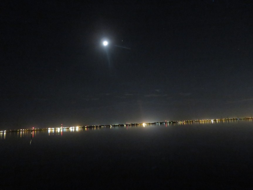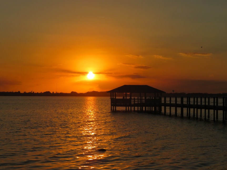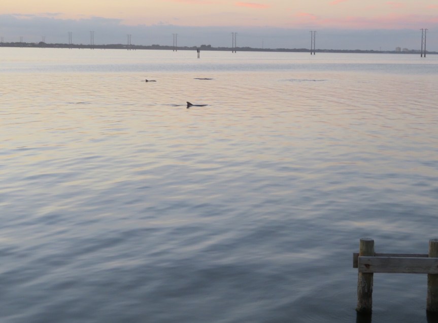 I got the new switch installed and everything is in good working order. Feels good to get things accomplished that I’ve been procrastinating on. I helped PJ clean all of the affected belongings with bleach and water to eliminate the mildew. She took anything that could be laundered to the laundry machines and washed it up. As the sun set, we took a little break to catch an amazing sunset over the Indian River. A large crowd of oldies gathered at the pool to sip their beverages and watch the bright orange ball melt into the far shore. A large pod of dolphins added their act to the evening entertainment and the audience was very appreciative.