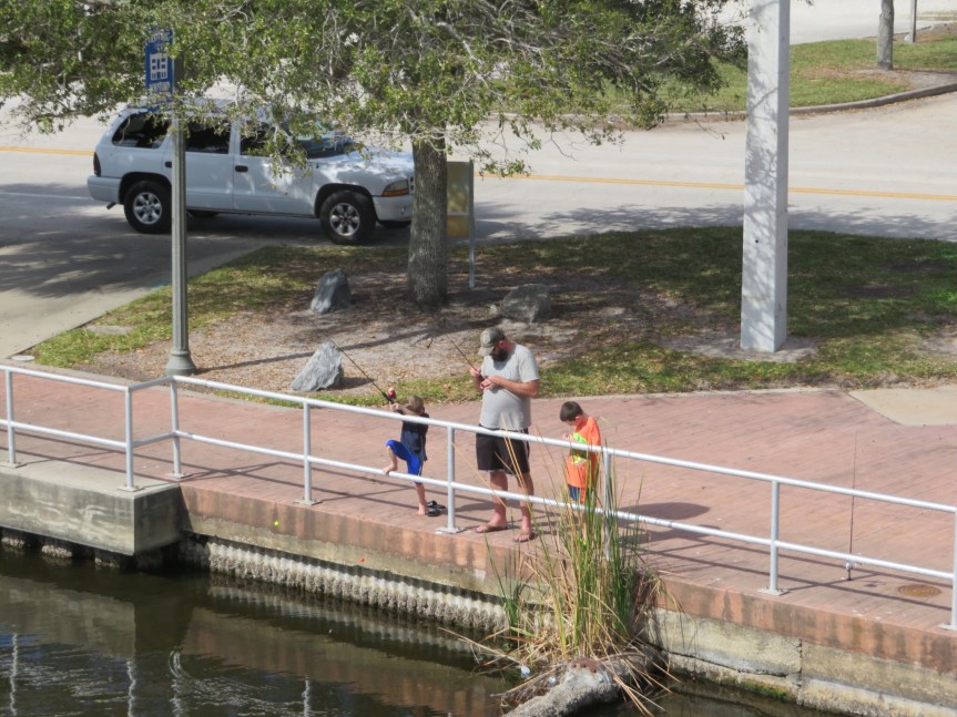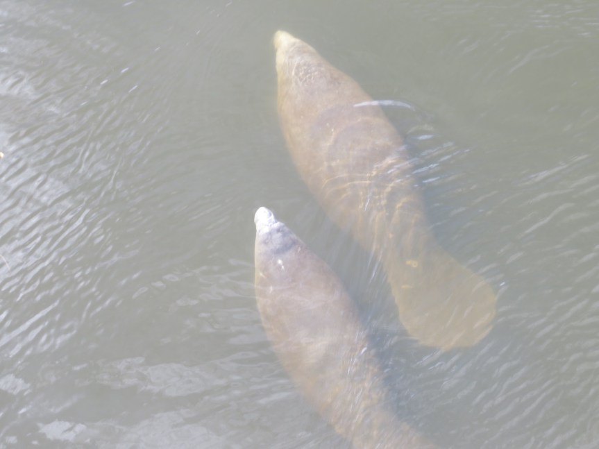 We hit the RV store and I got my switch and a few other small items for the camper. Since we were already out and about, I plugged the Crane Creek Promenade into the iPhone and we made our way over to the manatee observation area. We weren’t disappointed. We climbed the bank on the side of the road and walked out on the busy urban overpass to get a bird’s eye view and soon manatees started slowly floating by in groups of two or three. Homeless dudes on bicycles kept crossing the bridge on the narrow sidewalk while Cali stood cluelessly lost in her own little mental world blocking the road. It was awesome seeing manatees. I had never seen the mellow mammals before. A bearded bro fishing with his two young boys alerted us to the best place to view them and pointed out the first ones coming so we knew what to look for. We lingered about half an hour and saw probably a dozen of the sea cows.