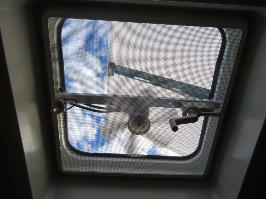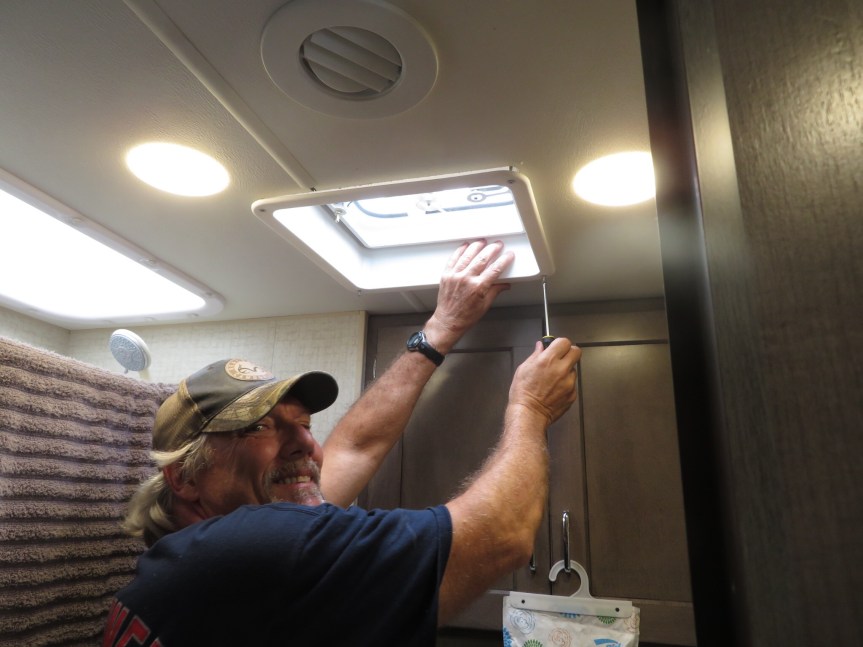 We drove back to camp only to find that the switch they sold me at Quality RV didn’t work. It wouldn’t click on to stay engaged. Bummed. The store closed at noon so there was no going back. I drove down to the Ace Hardware and they had a little switch that was compatible just brass rather than the original black plastic. On the way home, I stopped at the local beach market to pick up a few needed items for the larder then I returned to my project. Meanwhile, PJ had emptied everything out of the cabover area because we had discovered some mildew on the ukulele cases, our little day packs and other random spots.
