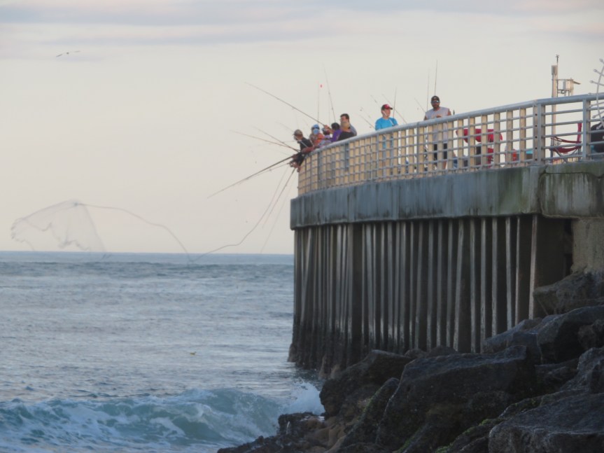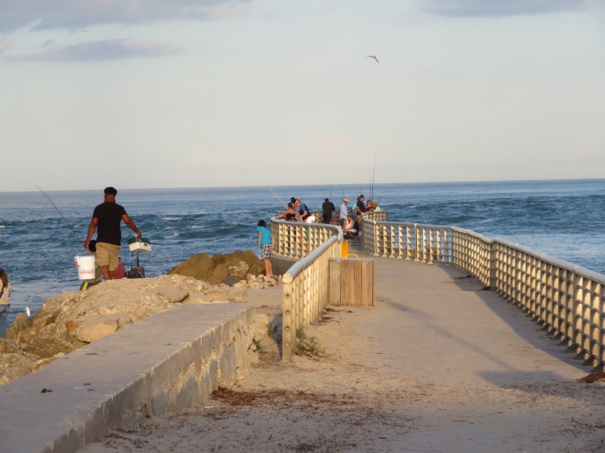 The shadows were growing long but we still wanted to have a look at the jetty at Sebastian Inlet, one of Florida’s premier surfing locations. We pedaled back to the park entrance and had a look at the small pier on the south side of the Inlet. Lots of fishermen getting in a final shot at angling fame and fortune before facing another long work week. Looking across the water, we could see a mob of hopefuls, rods and reels standing shoulder to shoulder seeking that elusive flounder or blue fish.