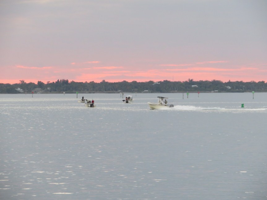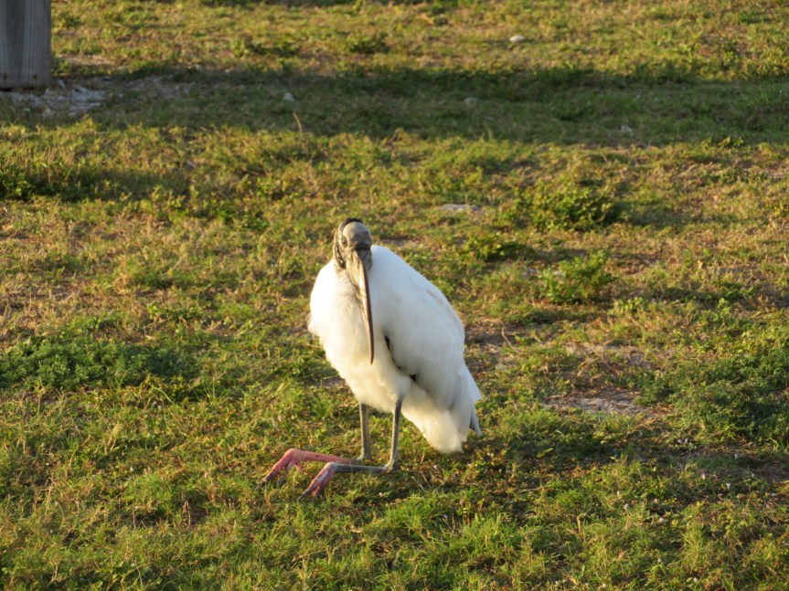 Back in the camping area on the south side, we found a comfortable bench and watched another outrageous sunset while tiny no-seeum type flies tried to make a sundown meal out of us. A new kind of funky looking stork like bird was hanging out on the grass by the fish cleaning area and some last minute boaters were racing for the boat ramps. It was still seventy degrees and comfortable in shorts and tees. Can’t beat it.