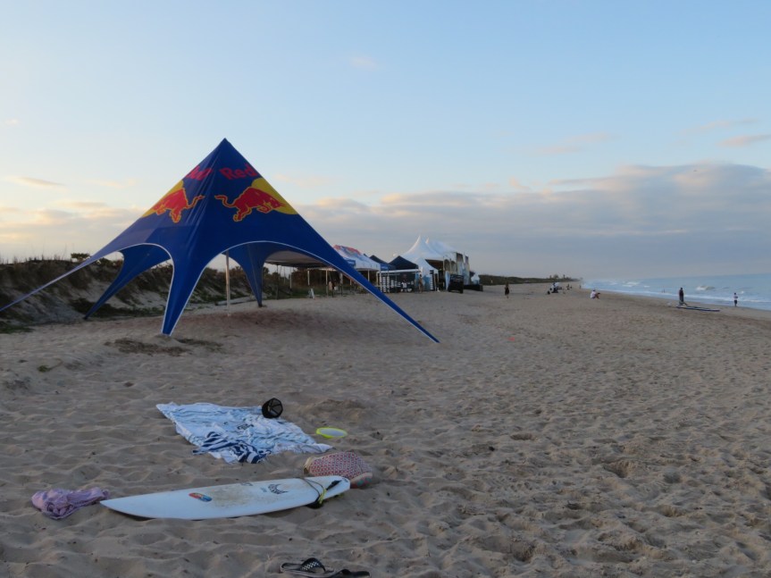 We exited the park and rode up over the narrow, shoulderless bridge dodging big duallys towing boats back home after a weekend of fishing. Once we pulled the uphill side of the bridge, we coasted rapidly down the steep hill taking in the view and trying to stay upright at the same time. The lady in the booth at the beach side of the Inlet wanted to charge us to get in but we explained that we were campers and were exempt. She let us in but said to bring the car pass next time. There were a bunch of tents and booths set up on the beach for the big surf contest that starts tomorrow.