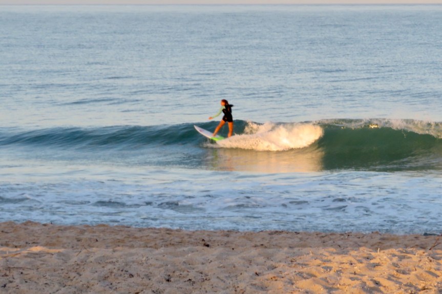 We walked out on the sand and watched the surfers catching some small waves and charging into the shore. Up close, it was crazy to see how packed together the fishermen are on the jetty. How they keep their hooks and lines to themselves is hard to figure. It was a fun beach day and there was good energy with a positive vibe as people walked around the beach. The women’s competition begins in the morning and there were some red hot surfer girls warming up on the waves that rebound off of the jetty. We could have stayed longer but the sun was going down and we didn’t bring any lights. We wanted to get back over the bridge before dark so we saddled up and pounded away on the pedals.