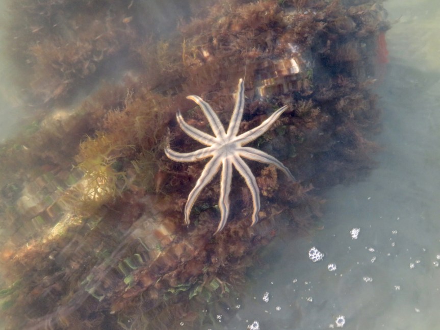 It was early afternoon when we met the nice rangers at Sebastian Inlet State Park and got ourselves set up in site #21. We rested up awhile then decided to hop on our bikes and have a look around. Up at the end of our little island sits Cocoanut Point, a spit of land with a shallow beach with clear water for swimming. We hopped in and got a quick wake up from the cool flowing water being careful not to step on the hermit crabs that were scuttling along the bottom. PJ hunted sea shells and I explored around the marina. PJ was excited to find a nine armed sea star and we checked out his little tube feet then put him back.