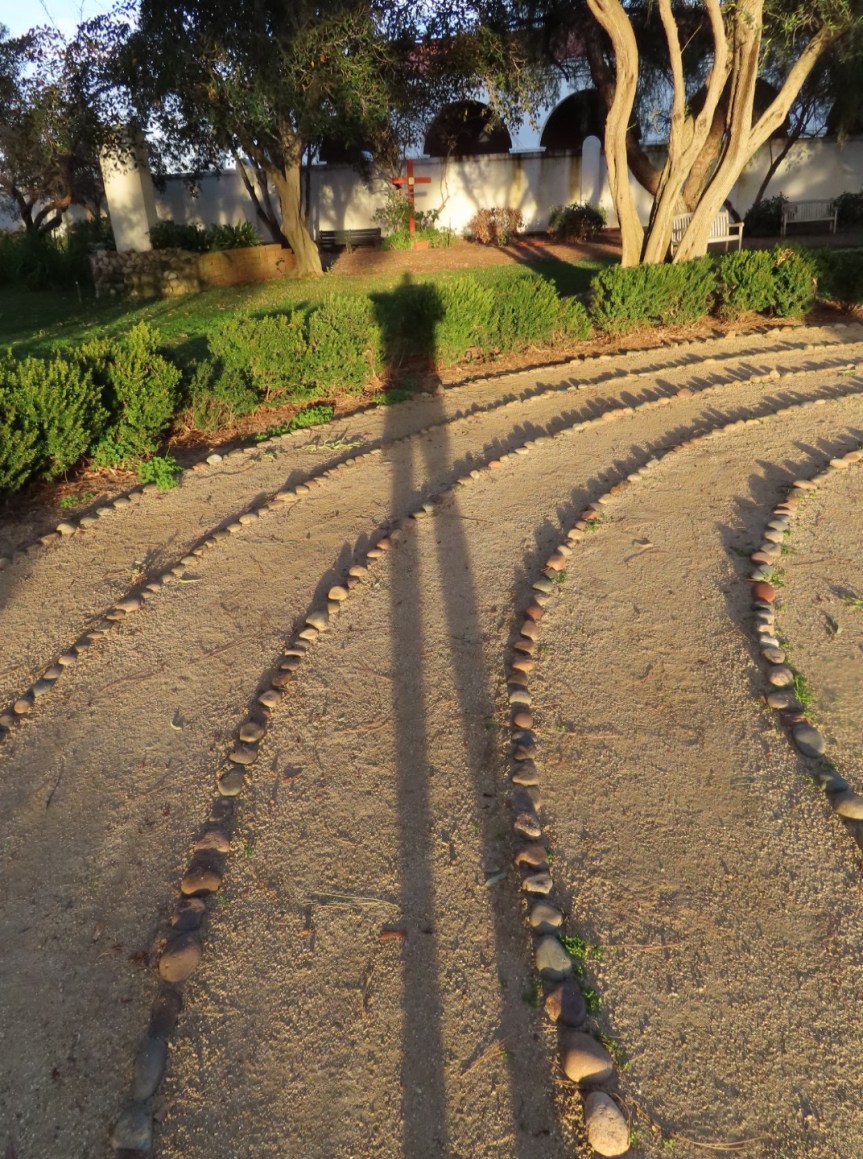 A walking meditation, a silent lunch and a meditation on a poem written by Rudyard Kipling, “If”. An interesting day of unique insights then a little quiet time in the afternoon. I wandered over to the mission itself. A military wedding was going on inside, so we weren’t able to sit in the church for silent contemplation as we usually do. Lots of tourists and people wandering the lush mission grounds for a Saturday outing. I walked through the cemetery, said a prayer at a family friend’s memorial then returned to the garden areas behind the retreat center and walked their little labyrinth.