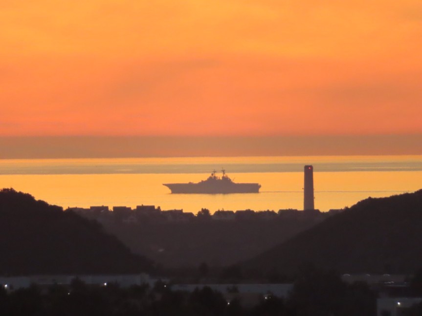 Spent the afternoon hanging out at Dad’s. At sunset, he and I took a walk along the urban trail that runs behind the houses on his street. We caught an amazingly clear sunset with sight lines all the way out to the beach. I was awed by seeing a large ship sailing past the Carlsbad power plant from all the way here in San Marcos. A warm, inviting evening for a day ending walk.