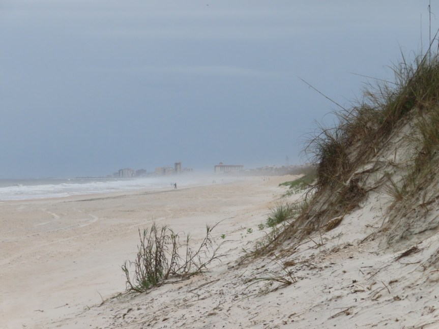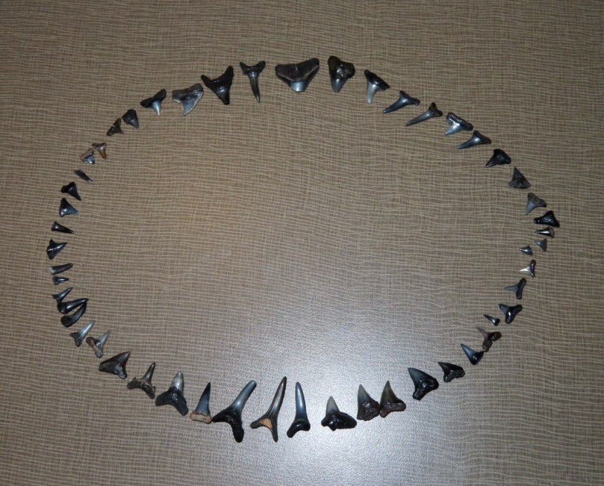 We had already found a couple of shark teeth while walking down to the water so we decided to prowl the waterline and see if there were any more. It is a form of walking meditation focusing on picking out the distinct outline of the different shaped teeth from among the busy chatter of the stacks of shells and pieces of shells that they are hidden among. It’s funny how we’ve come up with our own ways of finding them. The wrack line up high has already been picked by a host of other beach combers so we like to haunt the shallow zone where the water is actively pushing everything up towards the dry sand. For me, it’s easier to spot the form of the teeth when they are moving by the way they bounce against the bottom as the wave slowly recedes back into the sea. Another group was working an area near us and I have to laugh at myself when I feel a tinge of territorialism when people venture too near. Today, we set a new high, finding eleven teeth between the two of us. We had a thoroughly enjoyable day working our bodies enough to feel the tiredness and a bit of soreness from all of the activity in the water. A light rain began to fall around 4:00, so we packed it up and headed back to camp to start putting things in order for tomorrow’s move down to St. Augustine. We laid our collection of teeth on the table and we might have enough to make an entire shark if we keep this up. We are going to miss Hanna Park, a true hidden gem.
