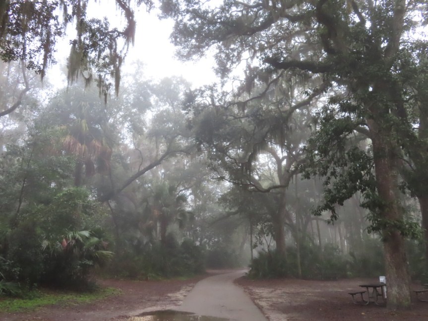 It rained pretty hard last night but by this morning it had blown through and was replaced by a thick fog. Cali and I wandered around through the trees in the ethereal mist. Moisture dripped from the hanging Spanish moss landing in a drumming pattern on the forest floor as we walked through a lightly inhabited area of the park. I tried to take some pictures but they don’t do this amazing oak and palmetto forest justice. Interspersed among the oaks and palmettos are occasional magnolias and sycamores. We sat at a quiet bench by the lake and watched the egrets take flight to start their day.