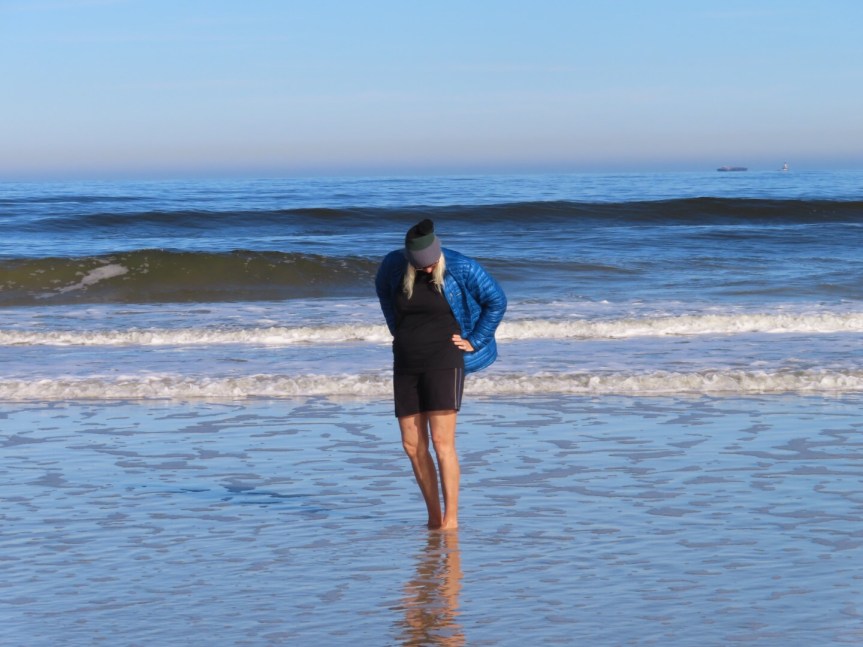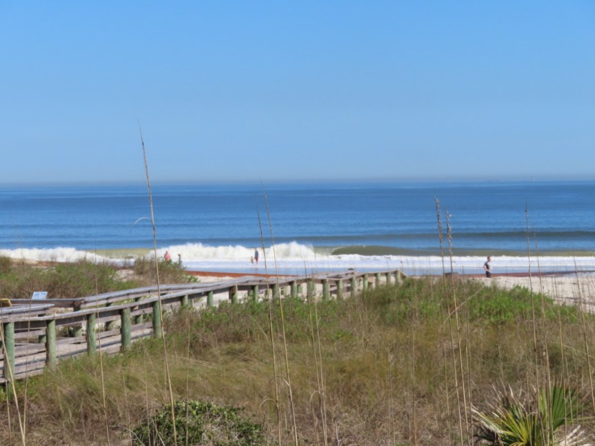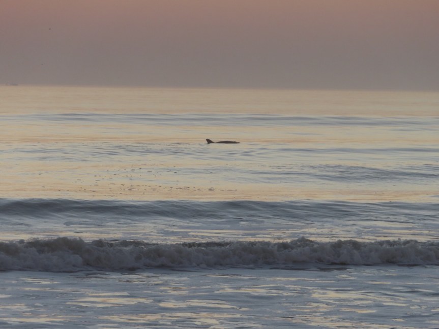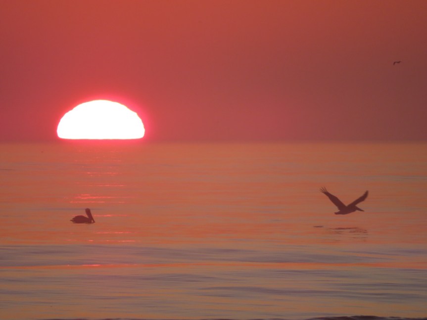 Cali had a restless night and was rattling her tags in the pre-dawn hour. I got up and took her for a walk around the neighborhood. Since I was already up, I decided to hop on the bike and zip over to the beach to catch the sunrise. It was a peaceful, clear morning with just a few other early birds out in the early hours. A few joggers and a man walking a small terrier. Dolphins swam in lazy circles while flocks of pelicans plied the Atlantic waters for whatever fish they could find. The sun rose out of the sea in a glorious burst of orange.