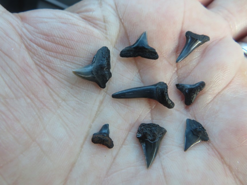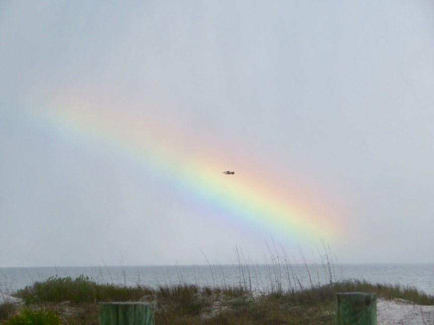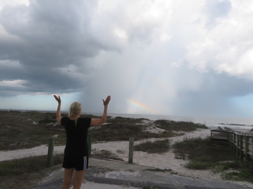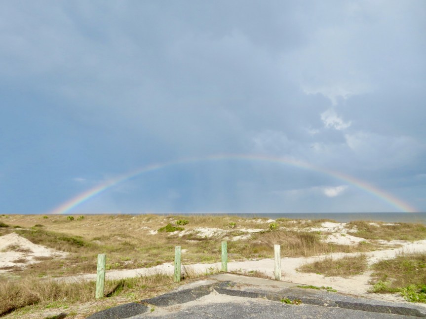 As we were splashing around in the shallows watching the shells and flotsam wash around our feet, a beautiful rainbow appeared arcing from one end of the beach to the other. The kaleidoscope of color seemed to bring good luck as the sun returned and we found eight little shark teeth between us. Sunburned and peacefully tired we came back to the RV for a relaxed unseasonably warm evening.