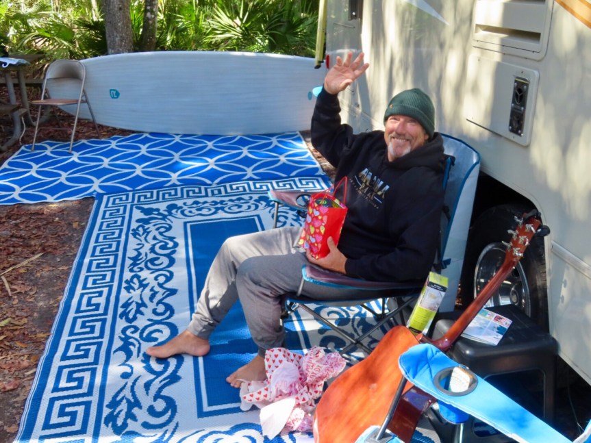 We relaxed in the morning sun and exchanged little Valentines gifts. It was still a little cool but much better than yesterday. PJ laid on her back and meditated looking up into the canopy of trees that surrounds our site. I did a little art project and played a few tunes on the guitar before we worked up enough motivation to ride our bikes over to the beach.