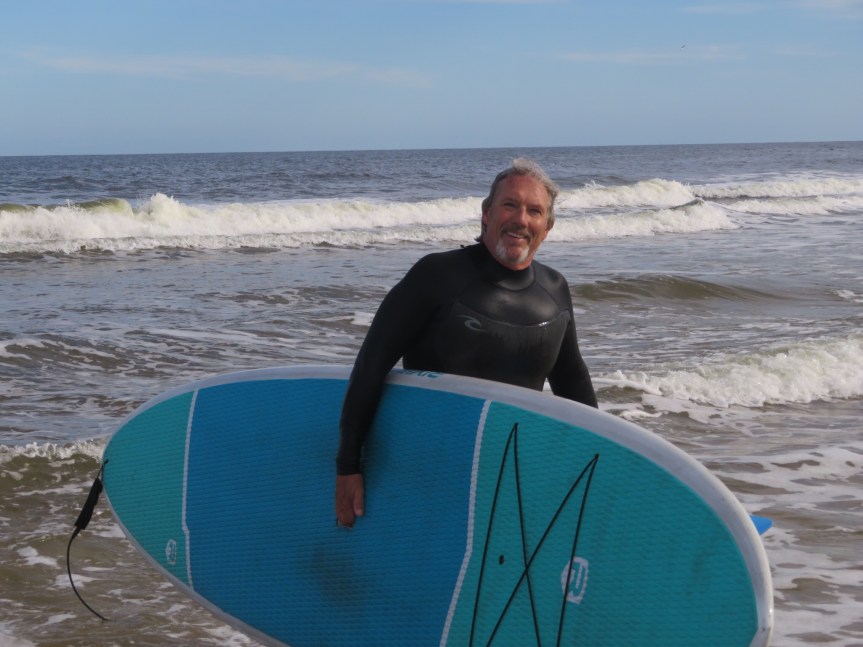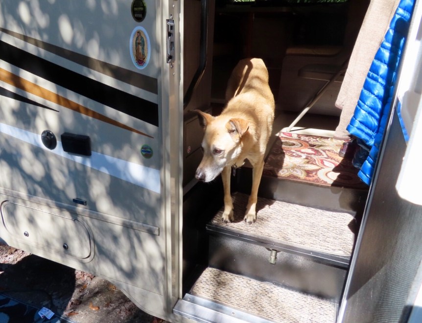 The waves had cleaned up quite a bit so I got inspired and sped back to camp and tossed the SUP on the car and jammed back to the beach to get in some practice. It was a lot harder than the first time because of the choppiness of the water but we traded off with each other and had a lot of fun. One of us would boogie board while the other did the stand up thing. We wandered around the shore after doing our usual search for shark teeth. We came up with three nice little additions to our growing collection. The day was winding down and we started getting cold so we packed everything up then PJ drove the car while I pedaled the remaining bike back to camp. Hot showers and dog walks as we start preparing for tomorrow’s move to the Karma Farms hipcamp.