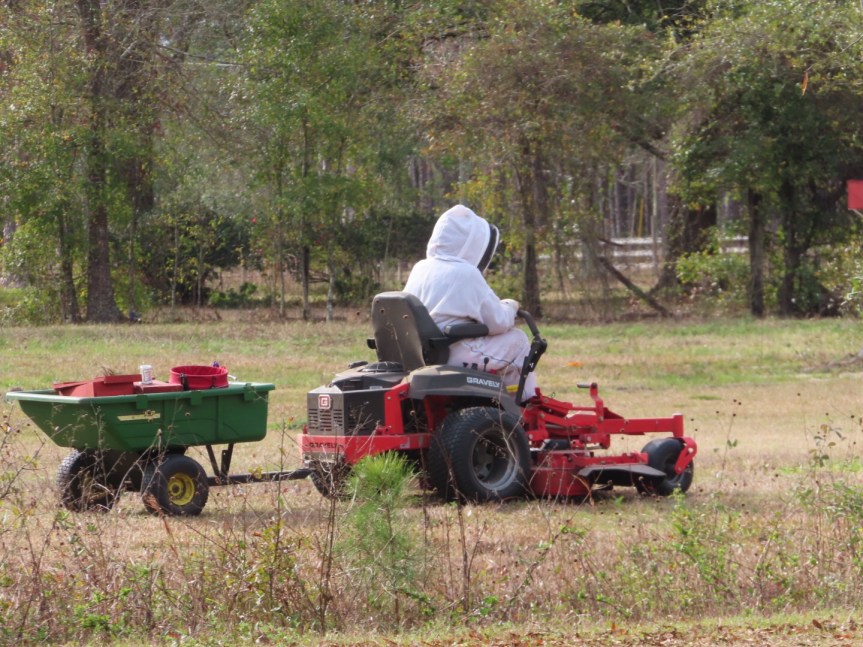 Lisa, the owner and master beekeeper, rode out on her little mower with the trailer and visited a number of the hives. She would smoke the bees to calm them and then split the hives so that they don’t get too overcrowded. It took a few trips and lots of diligent attention to get the hives all set to produce future volumes of honey. She stopped by afterwards and we got acquainted. Super nice folks.