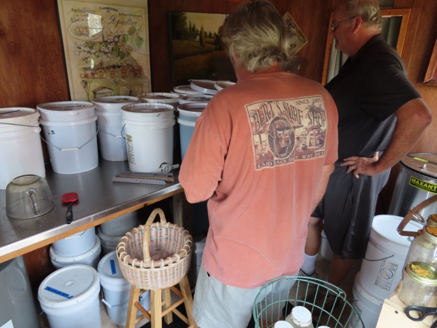 Lee came by in the early afternoon to clear the lounges off of the deck for us to do our yoga class later in the day. I asked him a few questions about the honey trade and he took us on a small tour to see how the honey is processed. The frames of honey combs are placed on a stainless steel spinner that looks somewhat like a bioreactor and it spins the squares of honey comb to remove all of the honey that then runs down to get captured in five gallon buckets. They have a pretty good stock accumulated in the processing shed.