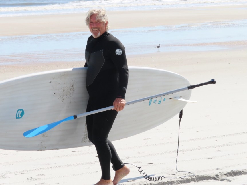 Good to be back at Hanna. We rode bikes over to check out the beach to start off the morning. A sunny day with just a hint of wind on the water. We returned to camp and I loaded the SUP onto the car and headed back to work on my paddling skills. PJ had some business to take care of so she stayed at the RV and spent a few hours working the phones. I paddled for about an hour battling the strong current coming with the wind from the south. I’d paddle about 150 strokes to the south and then it would take about 50 to get back to my starting point. It was lots of fun and it is getting to the point where I can look about without always having to concentrate on the act of paddling. I switched to the boogie board and had some fun splashing around in the nearshore waters then got out and lounged in my chair.