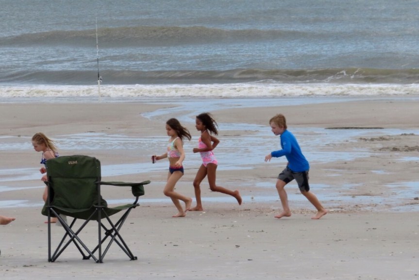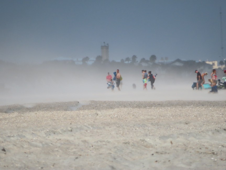 At around 3:00 o’clock, the lady to our left called out “hey, here comes the wind!”. We looked down the beach and a full on sandstorm was roaring at us from the north. It hit a few seconds later taking out umbrellas, sending people chasing their belongings down the coast and driving the crowds from the beach. It only took a few moments of sandblasting to convince us to join the exodus. Carrying the board was interesting while getting lifted off my feet by the gusts. We were laughing as we got packed up and headed back to camp.