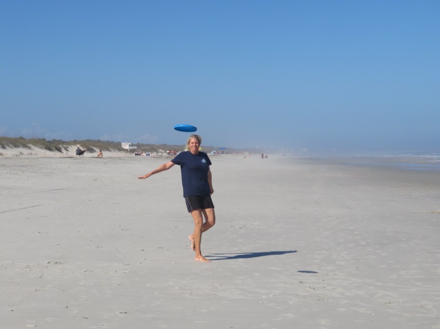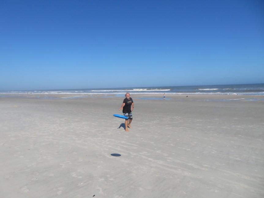 The sun had made an appearance and it was a nice, warm afternoon so we made our way over to the beach. The super moon not only creates the highest high tides but also delivered us a super low tide this afternoon. The beach was extra broad and open with lots of people out using the hard flat sand to ride their bikes. We worked up a sweat tossing the frisbee around then cooled off by taking our pool toys out into the surf. PJ braved it in a short wetsuit and it was a wetsuit shirt for me. Invigorating to say the least in the chilly northern Florida water. Afterwards we engaged in the zen of shark tooth hunting along the low tide line. In an hour or so, we came up with five between the two of us.