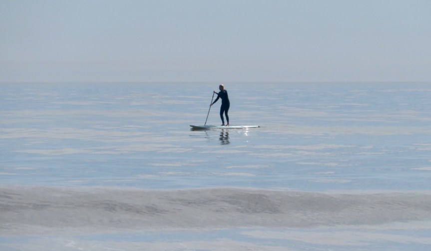 PJ is getting really good at the stand up thing. We can both go down the coast and back without getting wet. She was jetting down towards Neptune Beach when a large cow nosed ray floated up next to her giving her a thrill. We take turns and if it seems like something we can really get into, we’ll start looking at picking up another board.