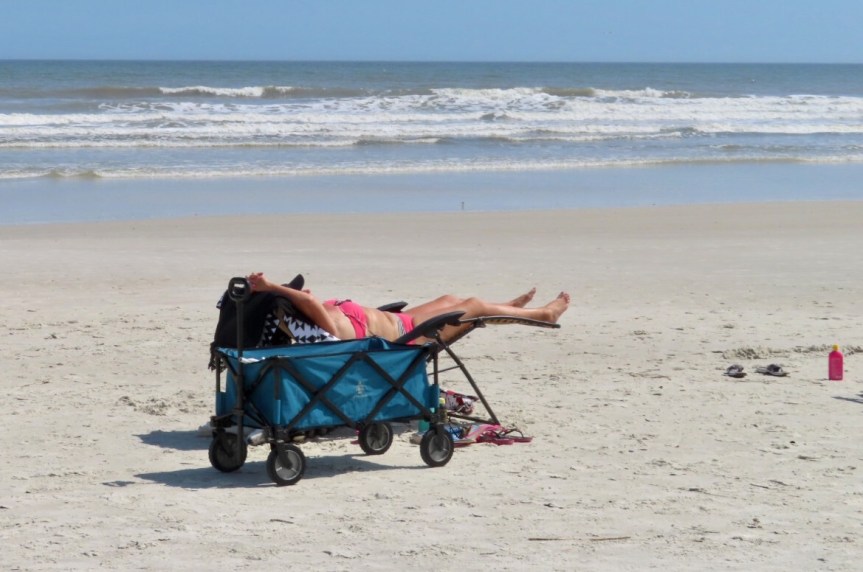 I took Cali home and sat out under the awning having a little breakfast and saying hello to the passing neighbors. Seems like nearly everybody these days has a dog of some form or another to walk around the campgrounds. At least here and Hanna Park, two of the most dog friendly zones we’ve come upon. By ten, it was approaching 75 degrees, so I grabbed the Walden and paddled out to catch some fun little 3 foot peelers in front of the condos next door. Best surf yet on the trip. Another guy joined me along with some passing dolphins and it was a refreshing positive start to my day.