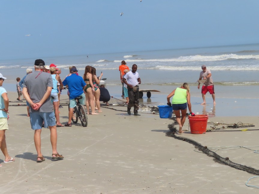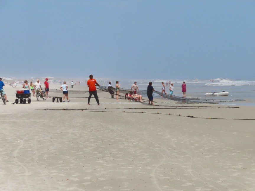 It was another warm day with small waves crashing close to shore. I was too lazy and pleasantly fatigued from yesterday’s exercise to bother hauling the SUP down to ocean. I instead grabbed the boogie board and a chair and went down to hang at the beach. After catching a bunch of fun little splashers I sat around taking in the warmth, reading my book and watching the activity around me. The big draw of the day was some “netters” hauling in their catch a few yards down the coast. I was talking to a fisherman earlier about what they catch here and when she mentioned netters, it was pronounced with scorn like Newman on the Seinfeld show “Nneetters!”. It’s obvious that the shore fisherman don’t care much for them. One guy rows out the net with a small rowboat and pulls it a couple of hundred yards down the beach and guys on each end muscle it in snaring everything in between. They almost netted up a trio of teenage girls sitting in their chairs relaxing on the beach. The crew caught a bunch of small fish and threw most of them back. Back towards the water, not always in it, splatting unceremoniously on the hard wet sand. Some more compassionate onlookers were going down and making sure the fish got back into the sea. I can see why the more sporting fishers hold them with a level of contempt.